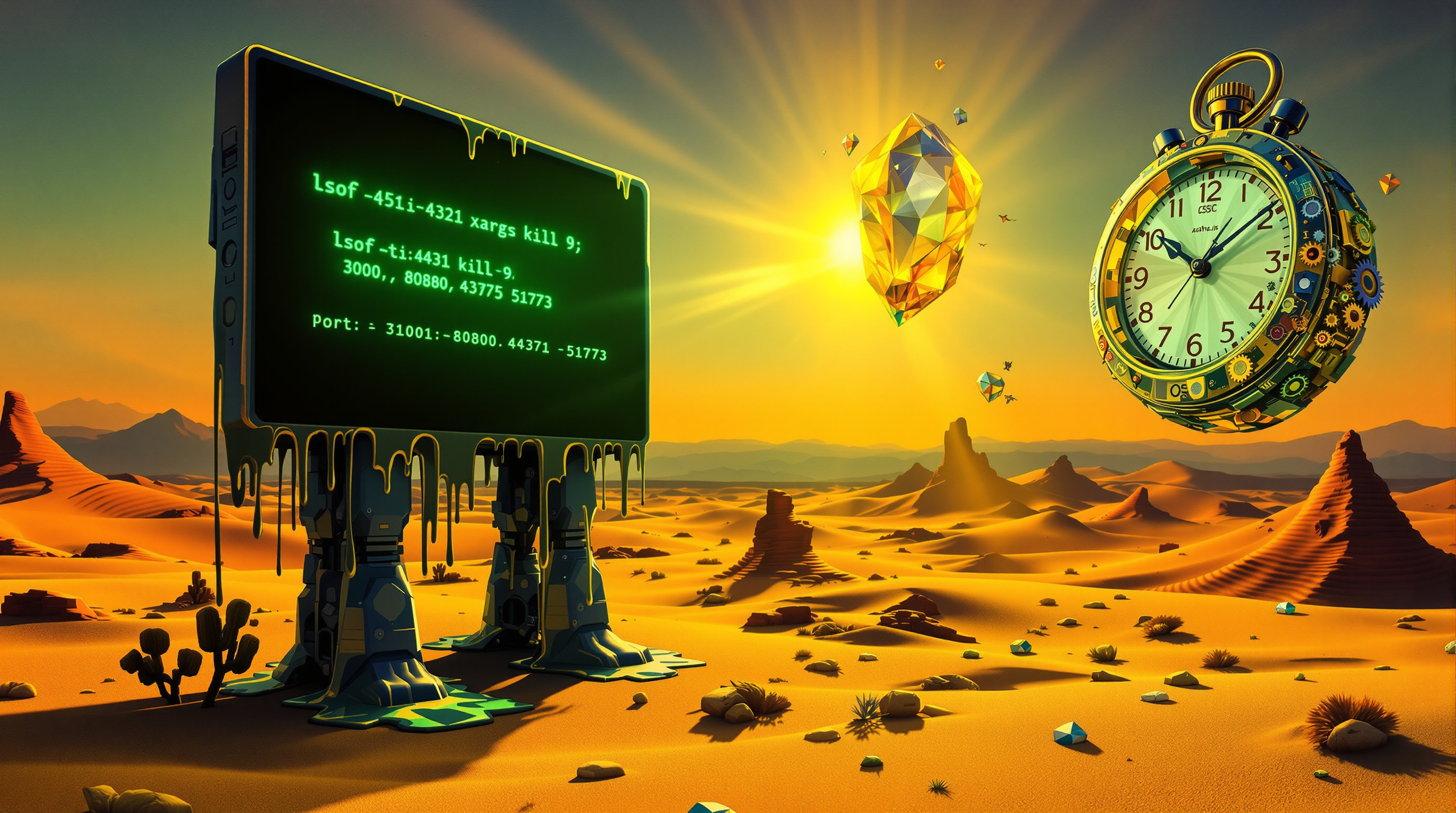 Surreale Darstellung eines Terminal-Fensters mit Port-Kill-Command im Dalí-Stil