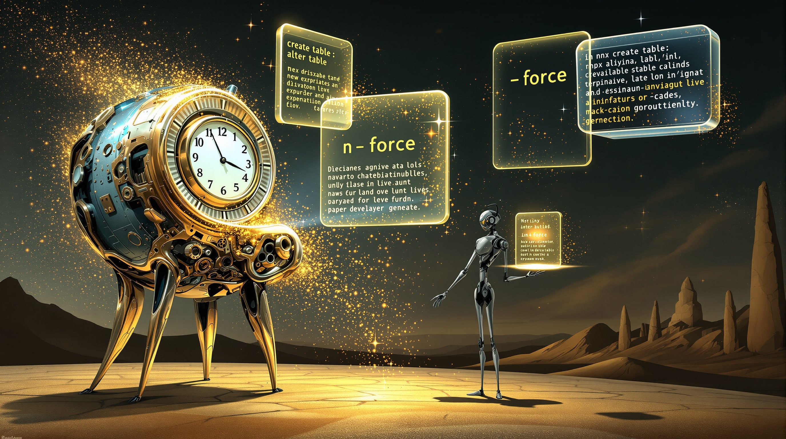 Uhr wird Datenbank, SQL-Dateien schweben, Roboter tippt --force für KI-Workflow