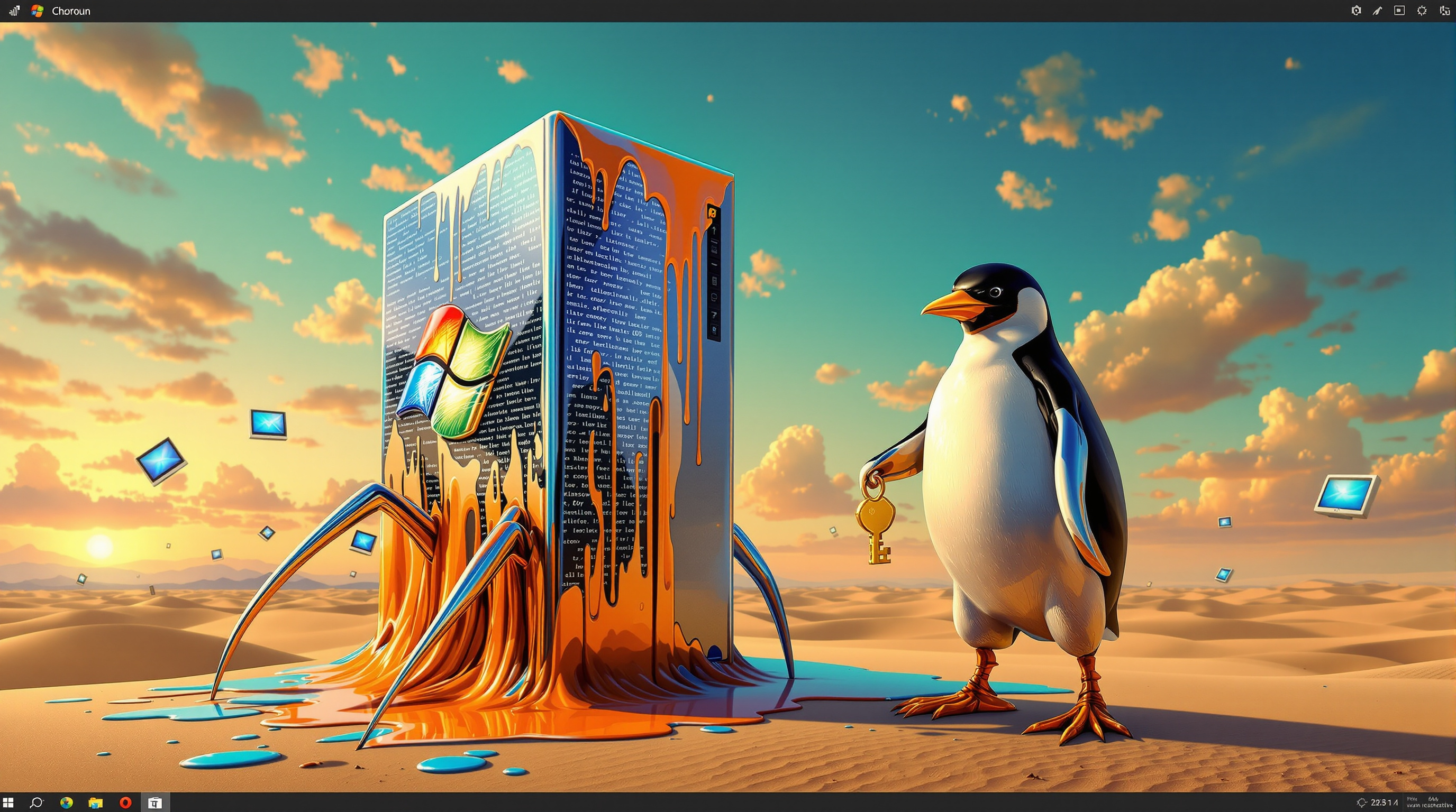 Surreales Bild: Windows-PC verwandelt sich in Linux-Pinguin im Dalí-Stil